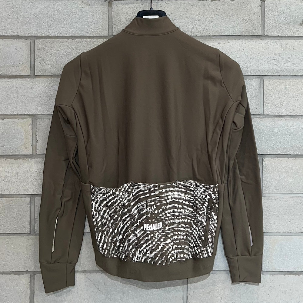 保温性と通気性を両立する高機能ファブリックを採用し、背面には暗闇でも視認性を高めるリフレクティブの「年輪」モチーフをデザイン。