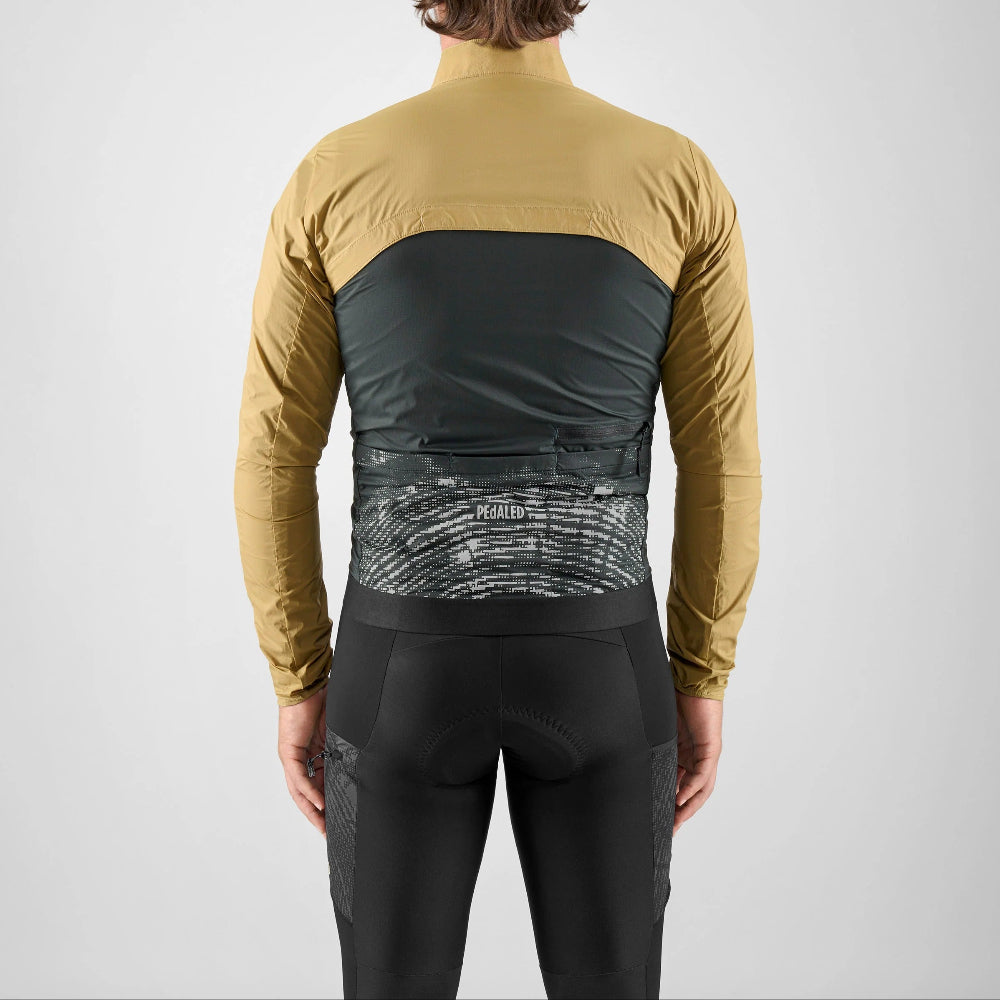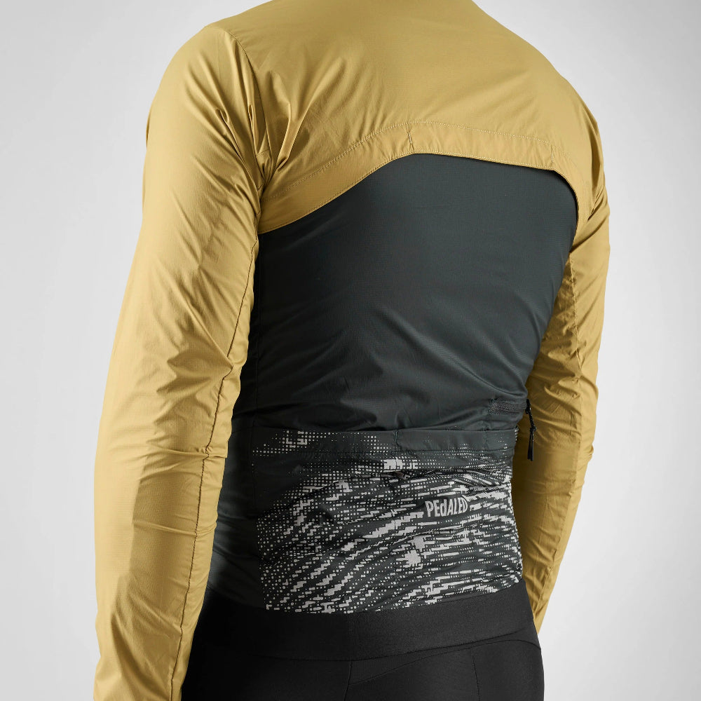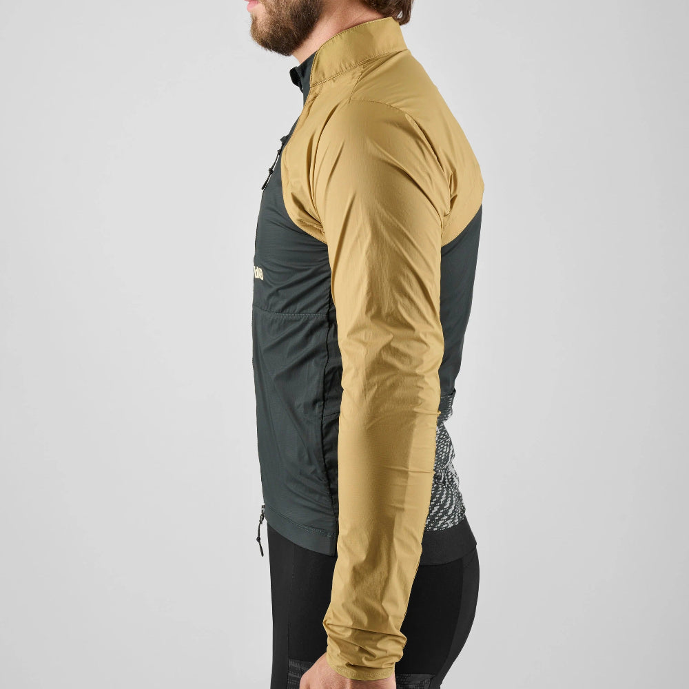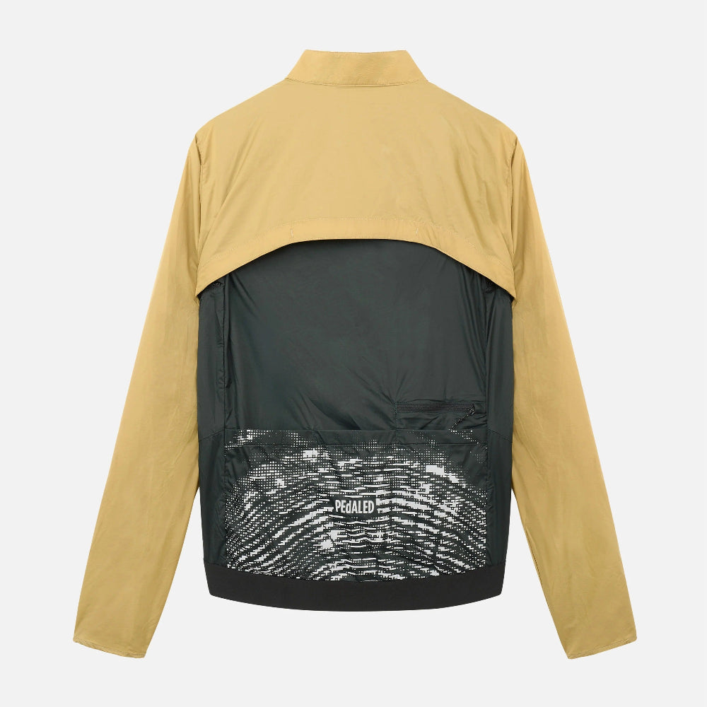 防風性に優れた素材と、背面のリフレクティブなツリーリングパターンが安全性と機能性を両立。