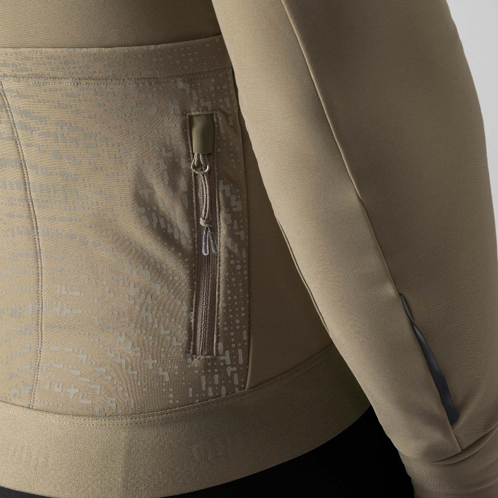 保温性と通気性を両立する高機能ファブリックを採用し、背面には暗闇でも視認性を高めるリフレクティブの「年輪」モチーフをデザイン。