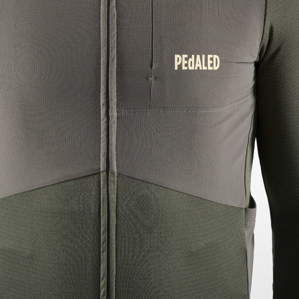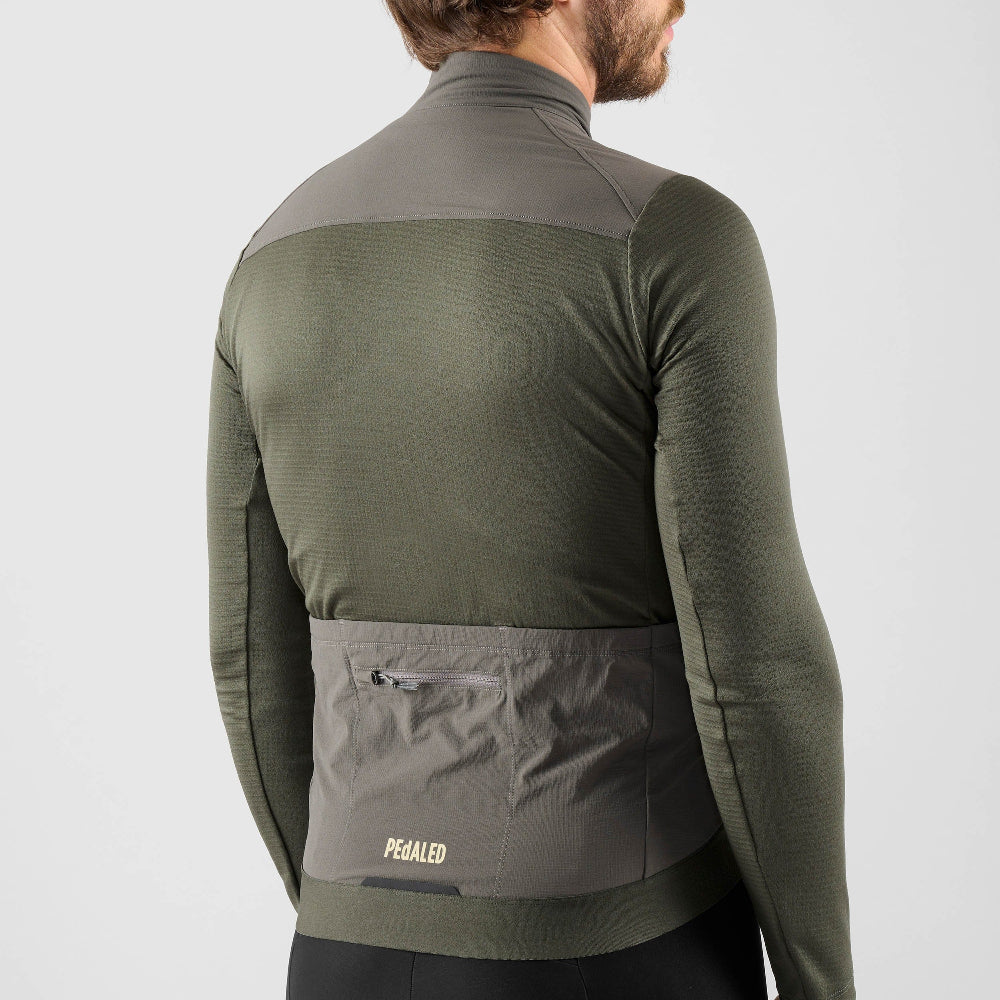 天然の保温性と吸湿性を備えたメリノウール混素材をベースに、前面には防風パネルを配置。